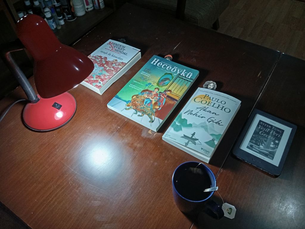 Evimde oturuyor ve boş zamanlarımda okuyorum. Bir Ocak gecesinde okumalıklarım resimde görünüyor. Bende her zaman okunacak iyi bir şeyler vardır.